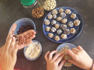 Mixez l’ensemble des ingrédients, ajoutez environ 1 cuillère à soupe d’eau pour obtenir une pâte légèrement collante. Formez des billes en les roulant dans vos mains, puis faîtes-les tourner dans un bol rempli de l’ingrédient décor. C’est prêt !